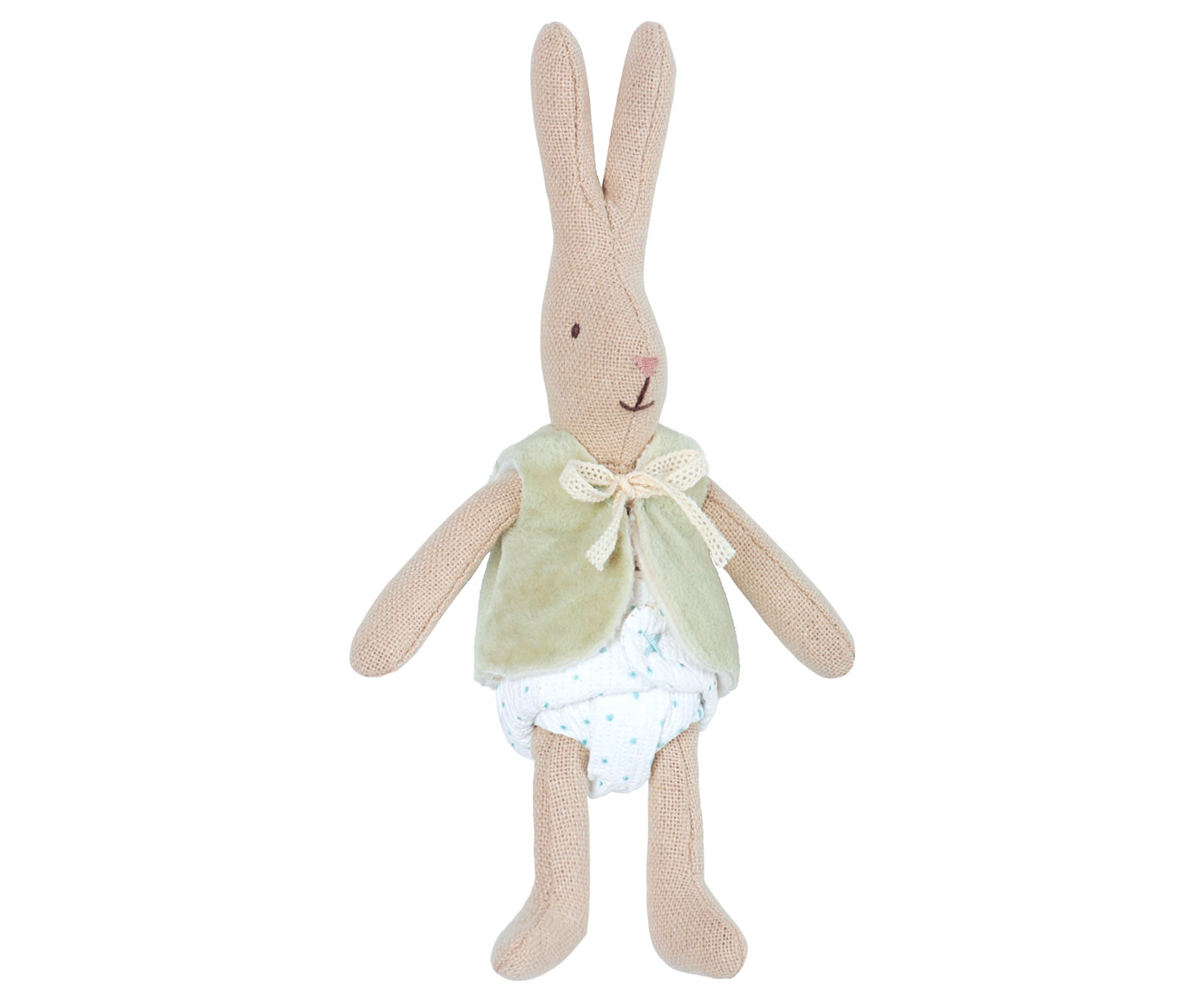Pieni suloinen Maileg pupu, jolla pilkullinen alaosa ja pehmeä vaaleanvihreä liivi ruusetilla. Tämä pystykorvainen pupu sopii täydellisesti pieneen lapsen käteen! Tälle pupulle sopii kaikki Mailegin Micro kokoiset vaatteet. Vauvaystävällinen. Konepesu 30°C.