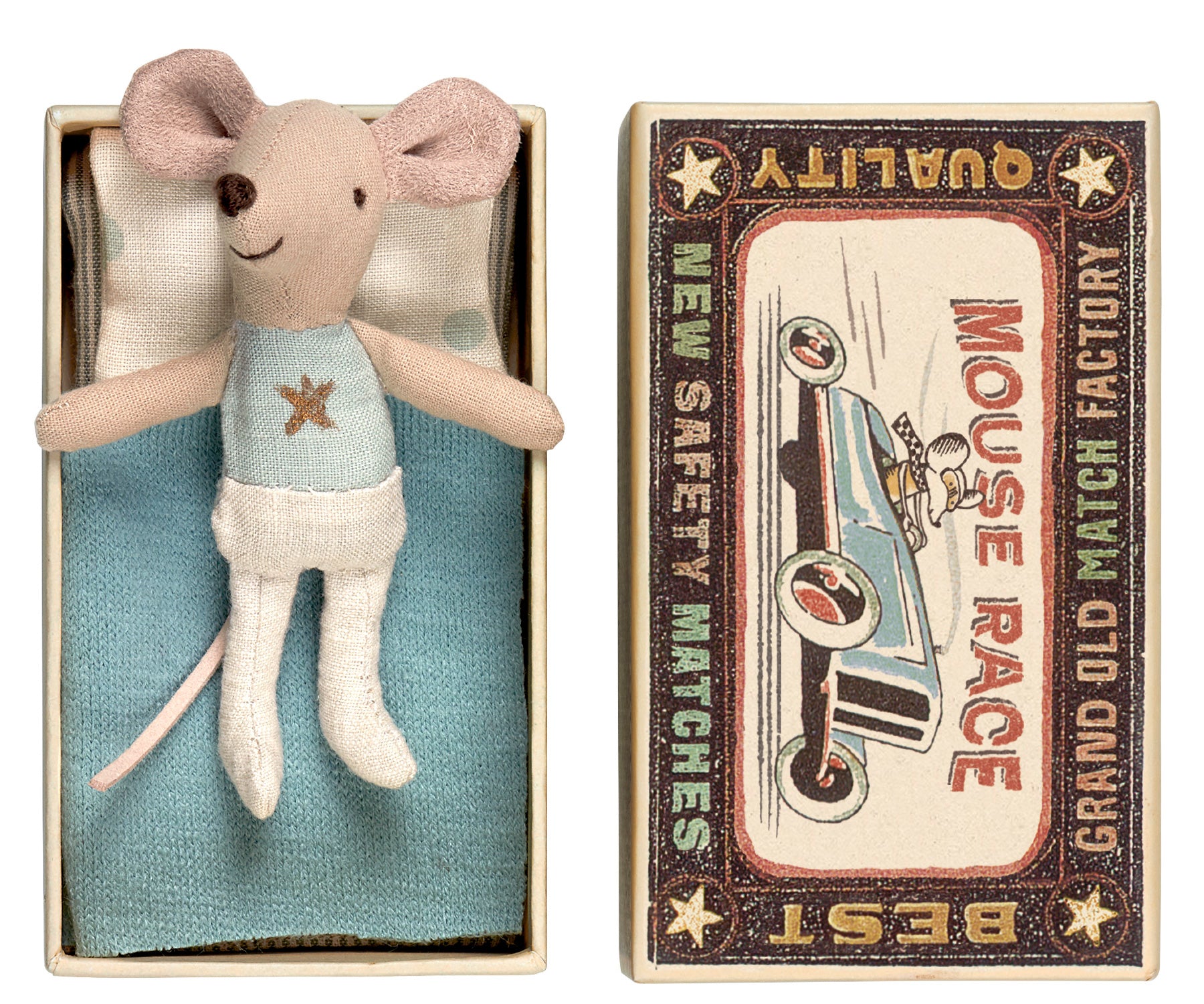Suloinen Maileg pikkuveli hiiri tulitikkulaatikossa. Mukana vuodevaatteet. Ihana ystävä pikkusisko hiirelle tai toiselle Maileg hiirelle.